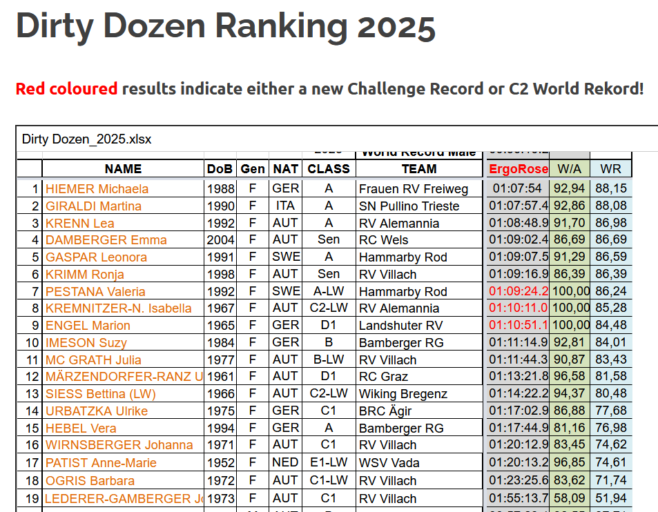 as Besondere an dieser österreichischen Serie ist die Kooperation mit der Skiff-Regatta „Rose vom Wörthersee“, die Anfang Oktober auf dem Kärntner See stattfindet und über 16 km von Velden nach Klagenfurt führt. Und so steht als zweiter Wettkampf im „Dirty Dozen“ die Ergo-Rose über die gleichen 16.000 m auf dem Programm, zu dem der Veranstalter der See-Regatta explizit nochmal alle Teilnehmer einlädt. In dem so vergrößerten Teilnehmerfeld konnte Marion nicht nur die Wertung ihrer Altersklasse gewinnen und etliche jüngere Teilnehmerinnen hinter sich lassen, sondern als Sahnehäubchen auch den neuen Weltrekord über die Distanz aufstellen. Die rote Zeit in der Ergebnisliste kennzeichnet die neuen Bestzeiten, die in den verschiedenen Altersklassen erzielt wurden. Die erfreuliche Bilanz ist auch auf der Challenge-Seite unter https://www.ergochallenge.at zu sehen.